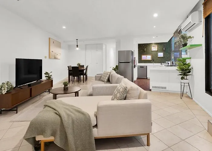 ベッドルーム2室のメルボルンAcacia Qvm - Free Parkingアパートメントはユーレカタワーから徒歩で20分で、Sea Life メルボルン水族館などの家族連れに人気のスポットから1.5キロメートル離れた所の場所にあります。 ビクトリア州立図書館すぐ近くに位置する広々とした110m²のアパートに宿泊すると、テラスでリラックスできます。
